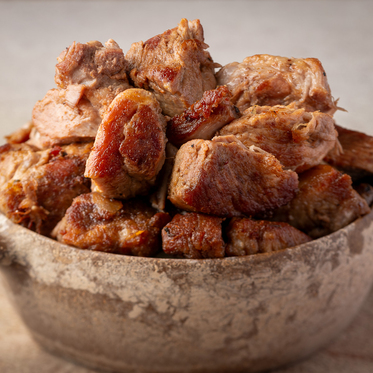 - Heat a tablespoon of vegetable oil in a large non-stick skillet over medium-high heat. Add pork pieces to the pan and sear on all sides. Press down with a spatula or weight it down with a cast-iron grill press. Cook until crisp and lightly browned (about 5 minutes) Turn over the pieces every 1-2 minutes.