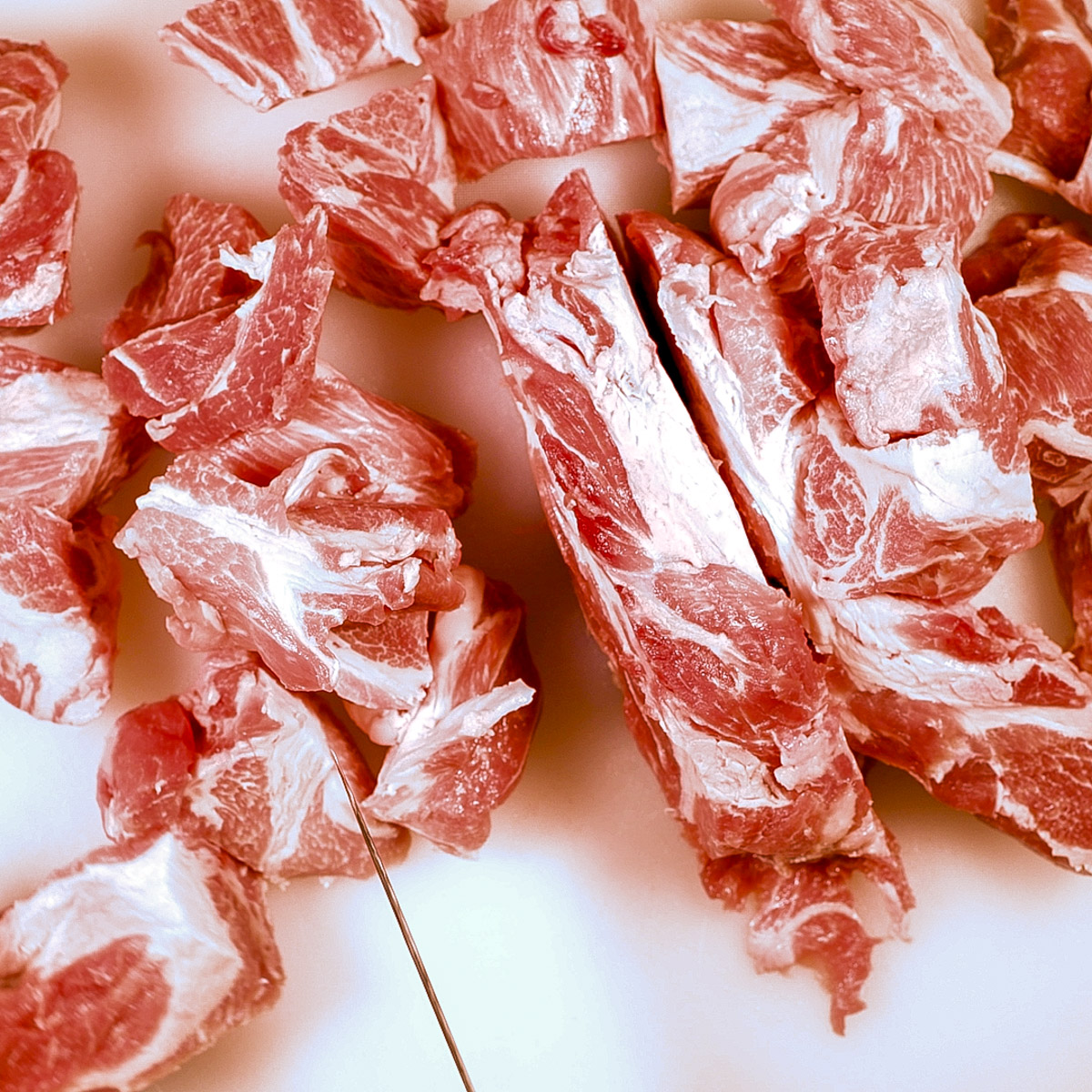 - Boneless pork shoulder trimmed and cut into 2" chunks