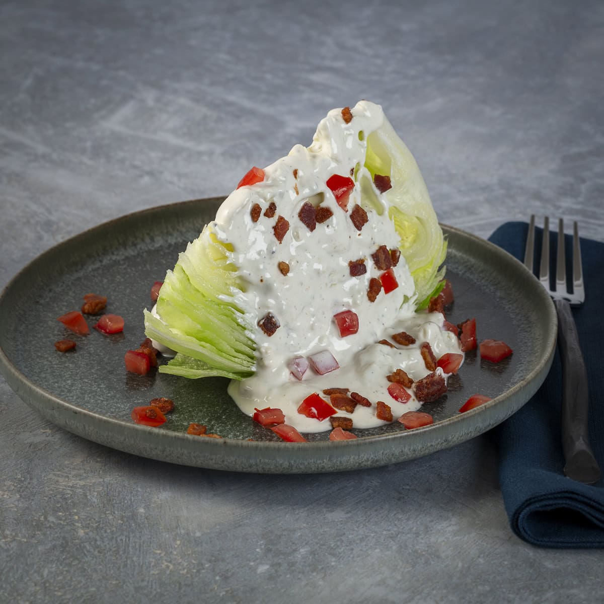 - Cut the lettuce into four to six wedges. Cover each wedge generously with blue cheese. Top with tomatoes, bacon, red onion and blue cheese crumbles. Top with freshly ground black pepper to taste.