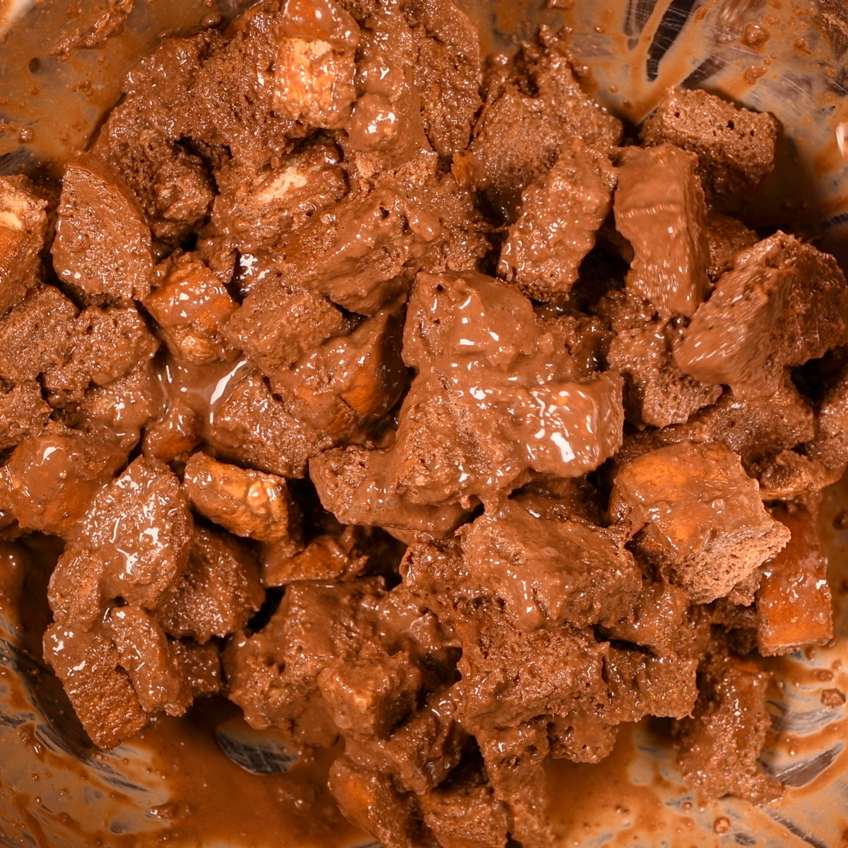 Place soaked bread cubes in a cast iron skillet and cover with remaining chocolate mixture.