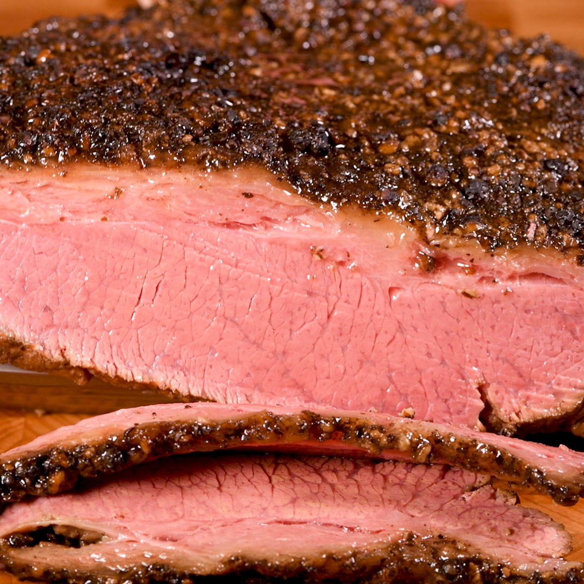 Pastrami has some fat on it and a brisket flat will have a layer of fat on one side that you want to keep. After soaking in a brine solution for a week, the brisket will be coated with a layer of crushed peppercorns and coriander seed and then smoked, low and slow, for 6 hours. After a 2-hour rest, the pastrami is ready to slice and enjoy. It will be a beautiful pink color throughout.