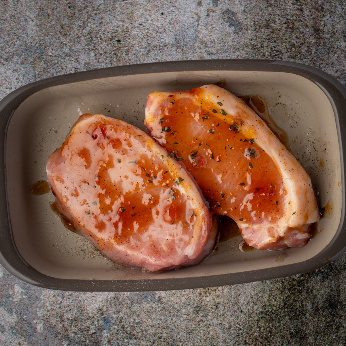 Rub the pork chops with olive oil and season with salt and pepper. Place them in a baking dish and pour ½ cup of the glaze over the chops. Split the remaining glaze into two portions.